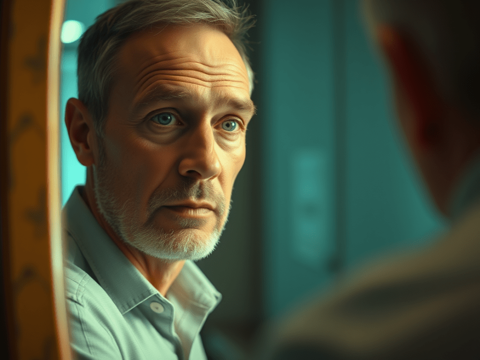 at a white-bearded face looking back from the mirror